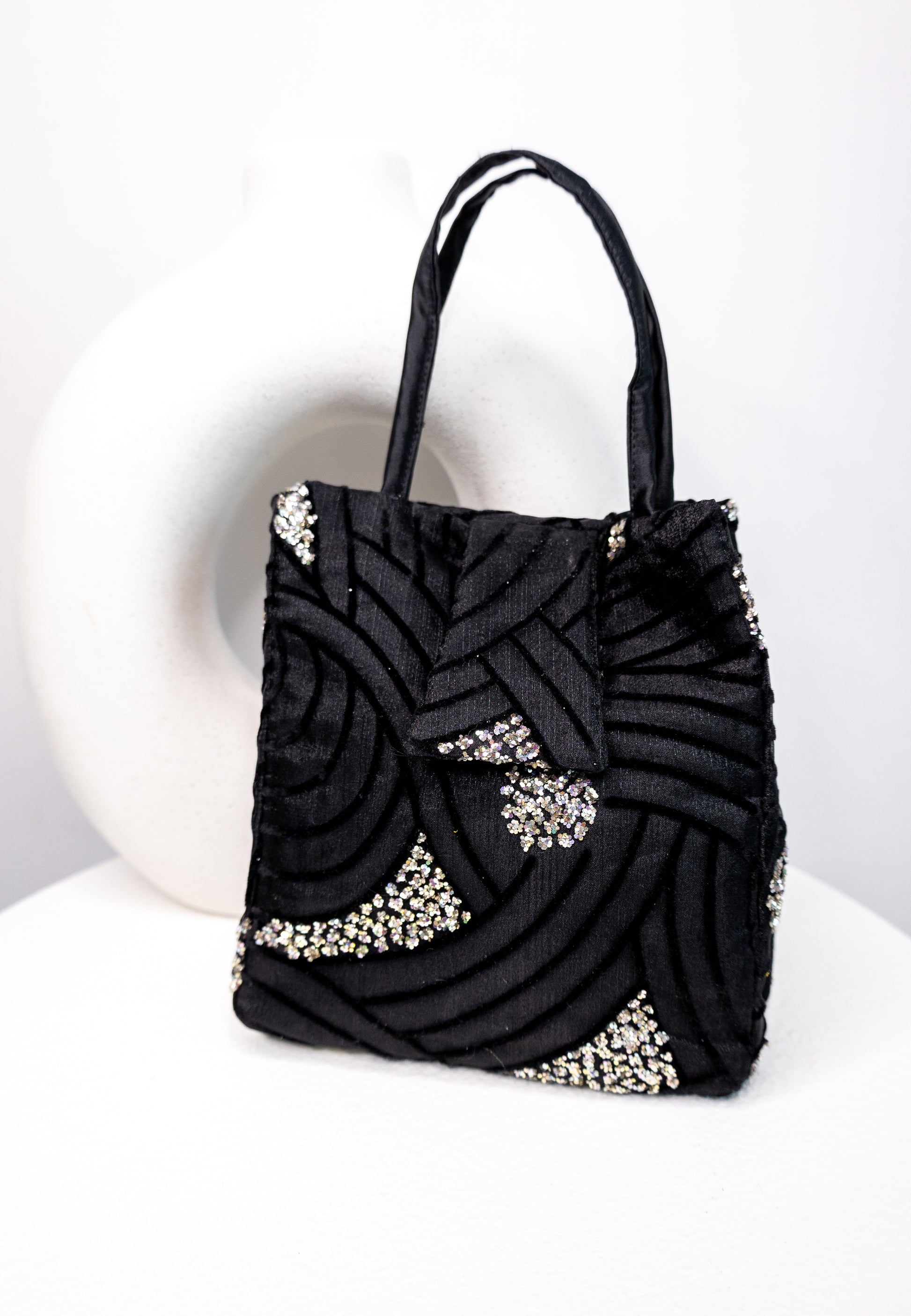 Fabric: Black Organza with velvet swirls and embellished with clusters of sparkles.